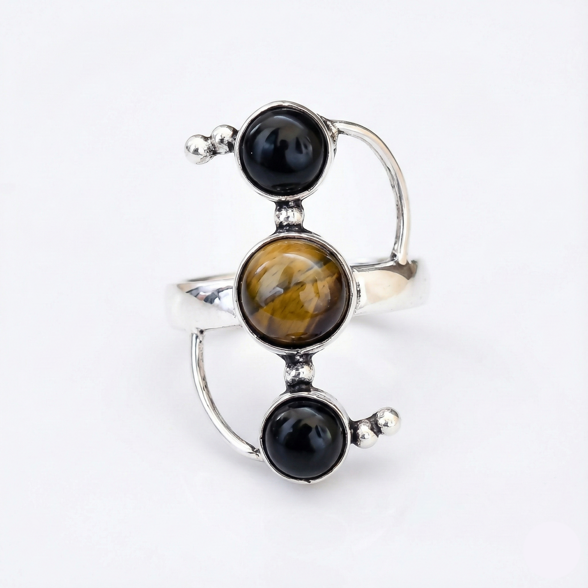 Sterling Silver Statement Ring with Tiger’s Eye and Black Onyx Ring-Handmade Boho Statement Gemstone Ring-Artisan Jewelry Gift for Her