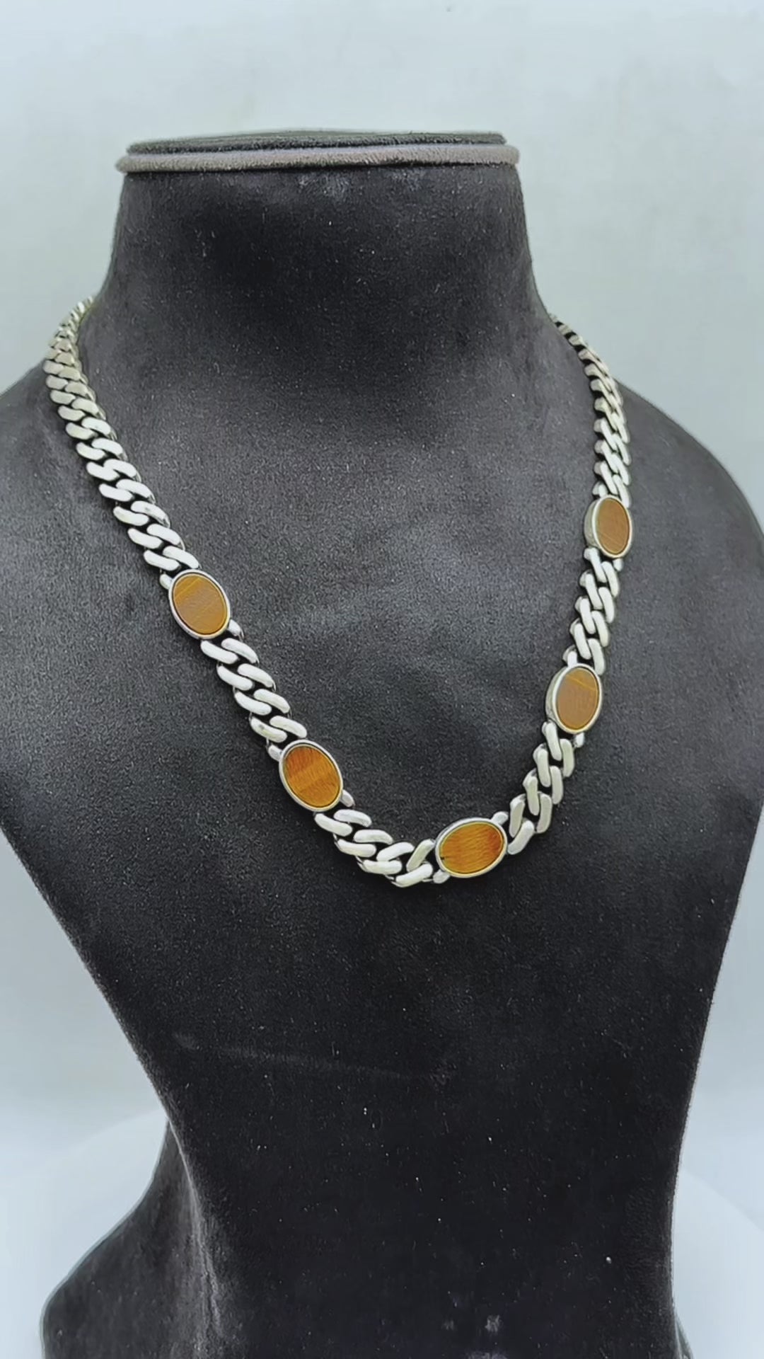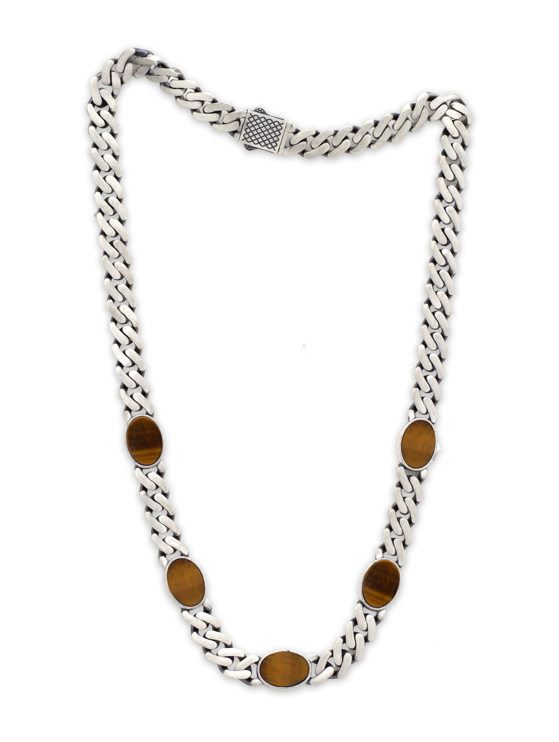 Sumptuously rugged, this refined chain fuses a bold Cuban-link silhouette with rich tiger’s eye ovals that glow in warm amber tones. The brushed silver finish and patterned clasp deliver a designer edge, while the earthy stones add a touch of grounded luxury to any look.