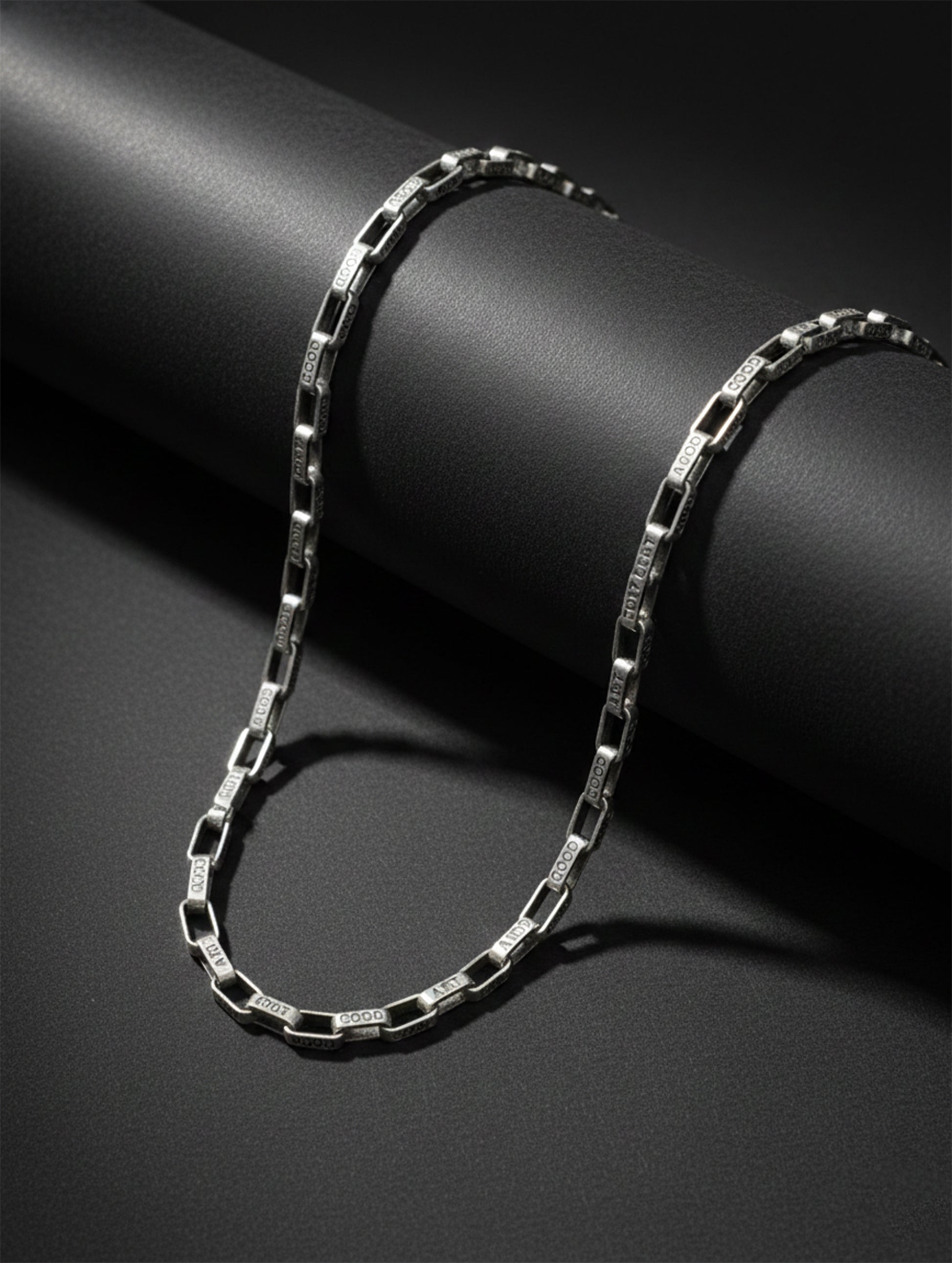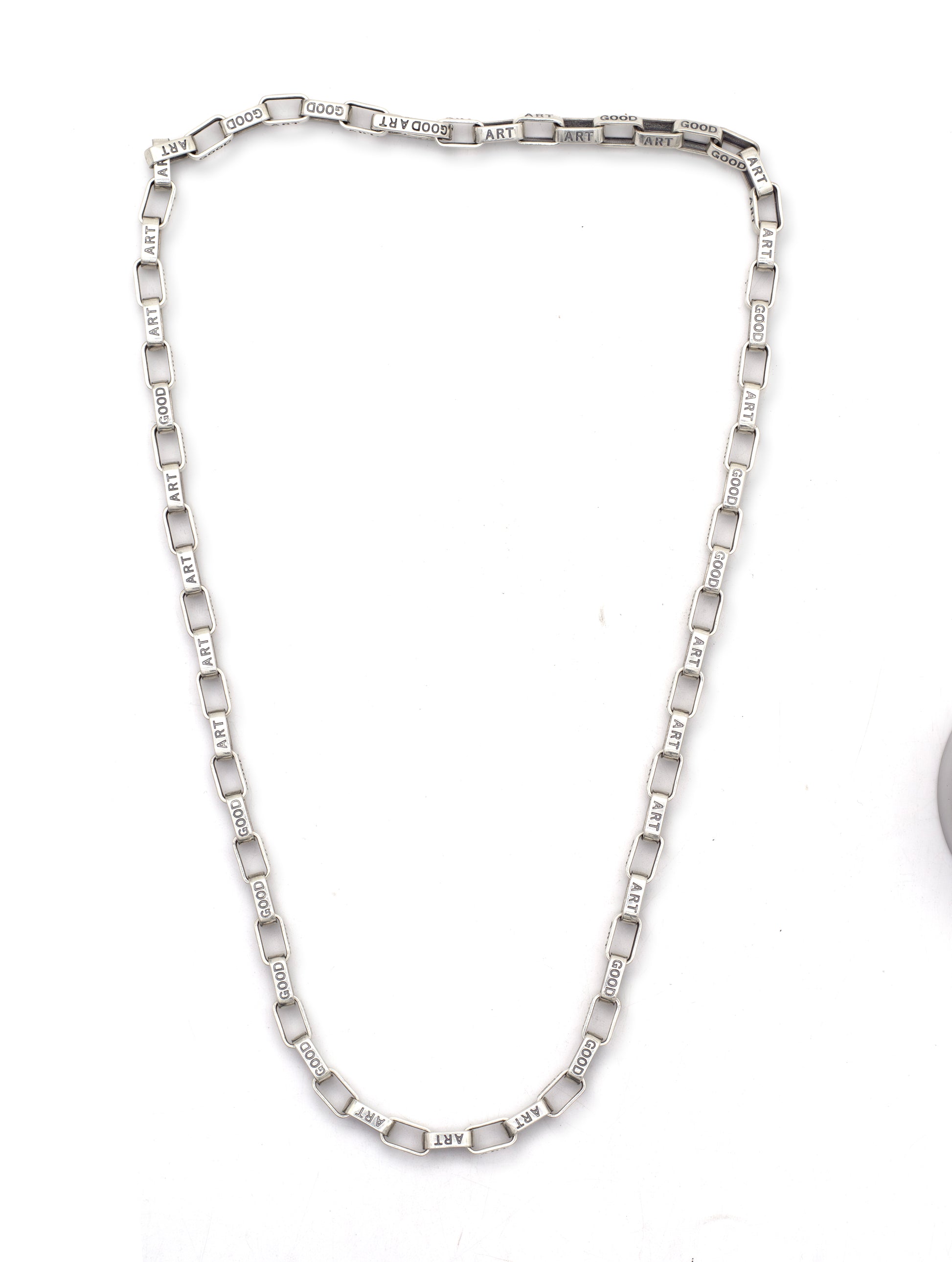 Regally refined, this slim square-link chain weaves the words “GOOD ART” into every segment, turning typography into wearable luxury. Each polished block link lies smoothly against the skin, creating a minimalist yet statement-making silhouette. Perfect solo or layered, it adds an artistic, gallery-chic edge to any look.