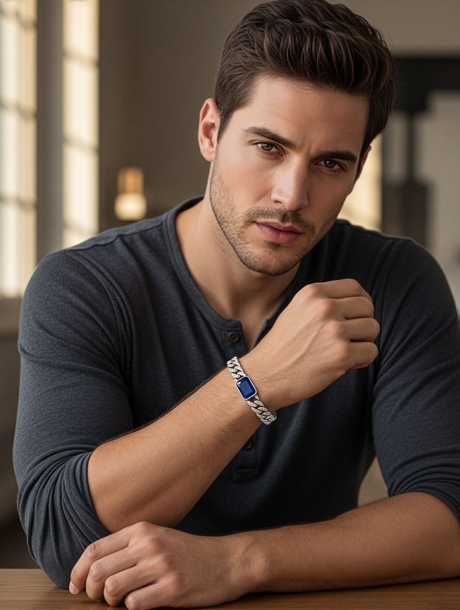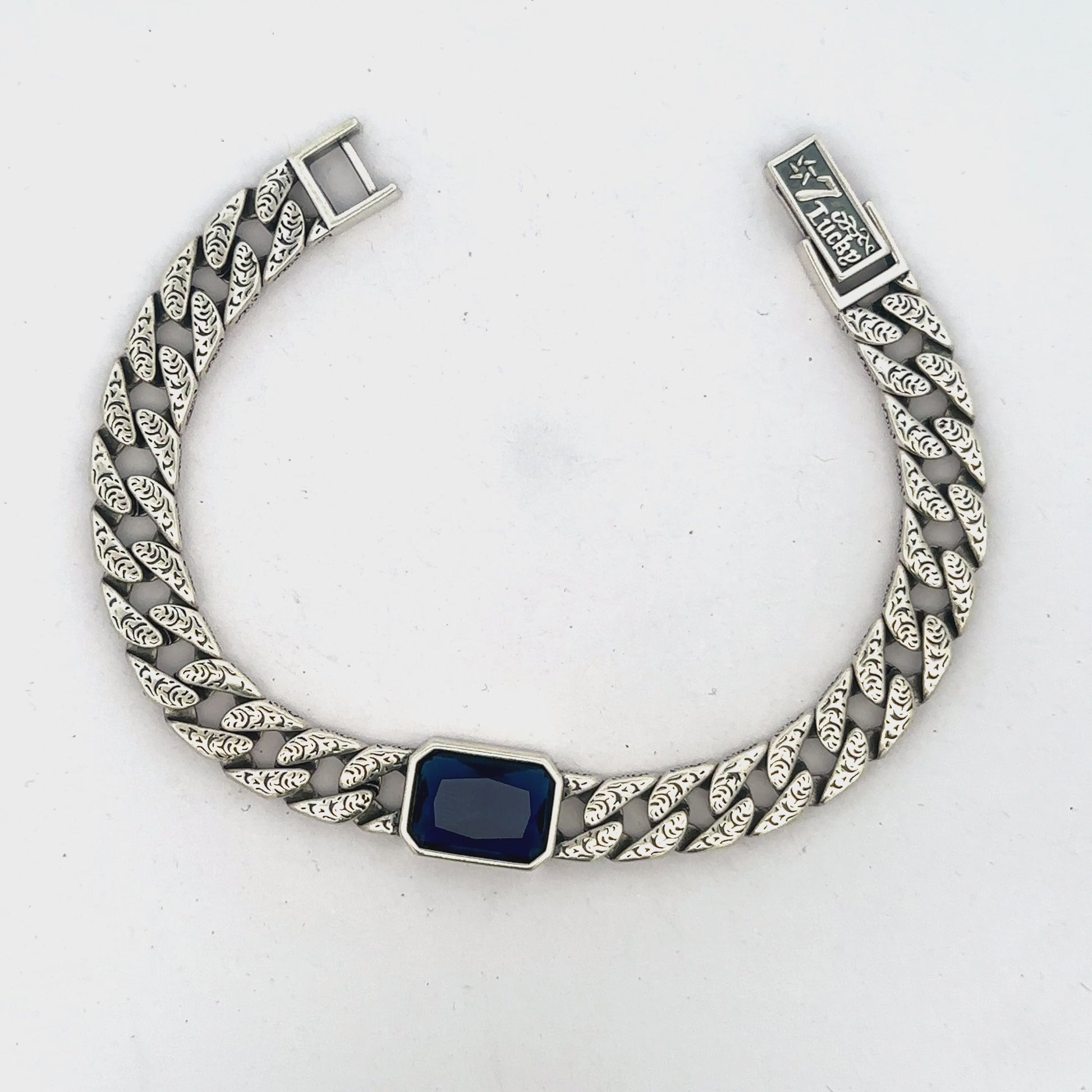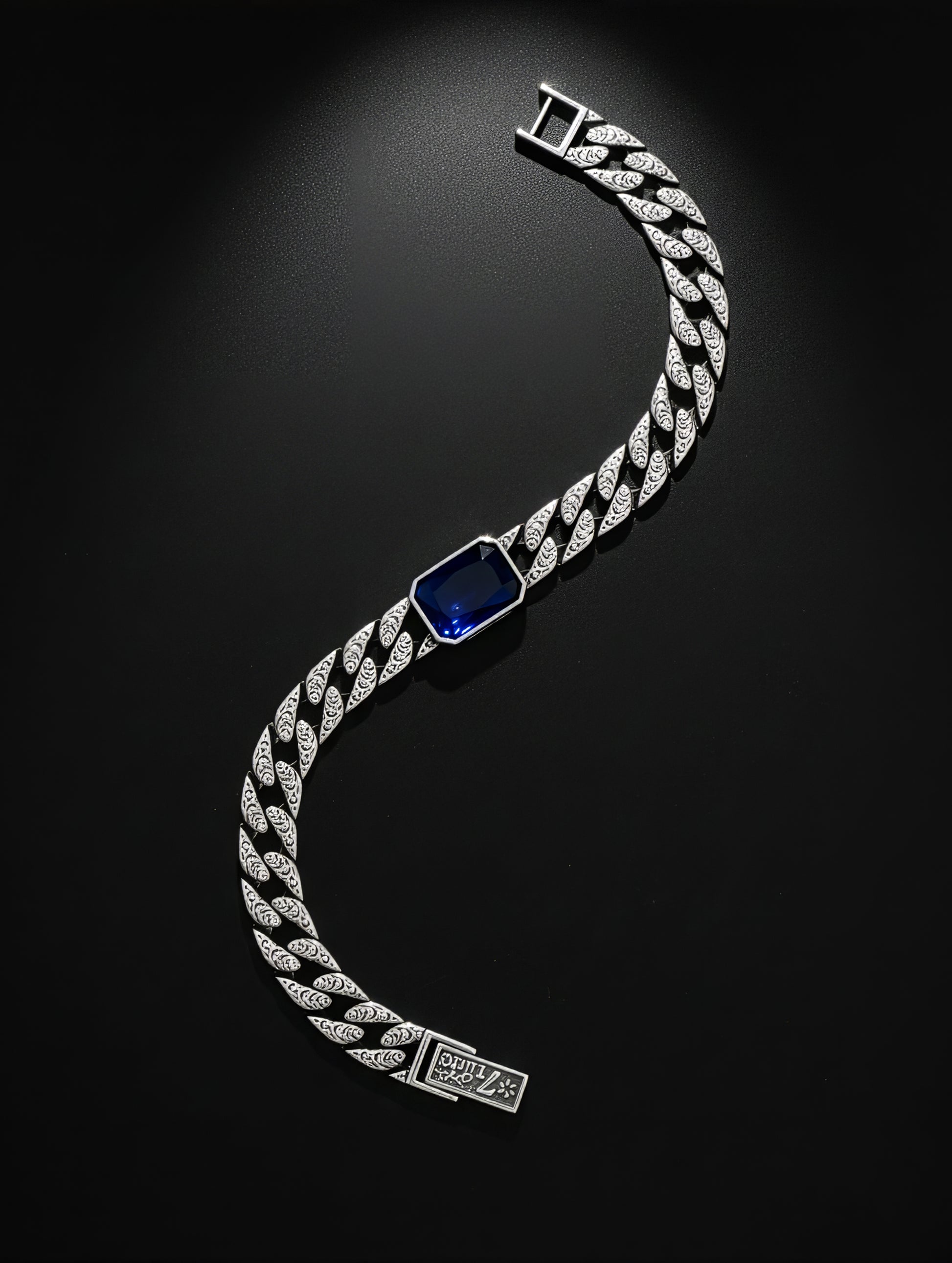 Royally striking, this bracelet fuses a bold, engraved Cuban link chain with a captivating deep-blue emerald-cut stone at its centre. The rich contrast of midnight blue against polished silver gives it a luxurious, modern-maharaja vibe that instantly elevates any wrist.