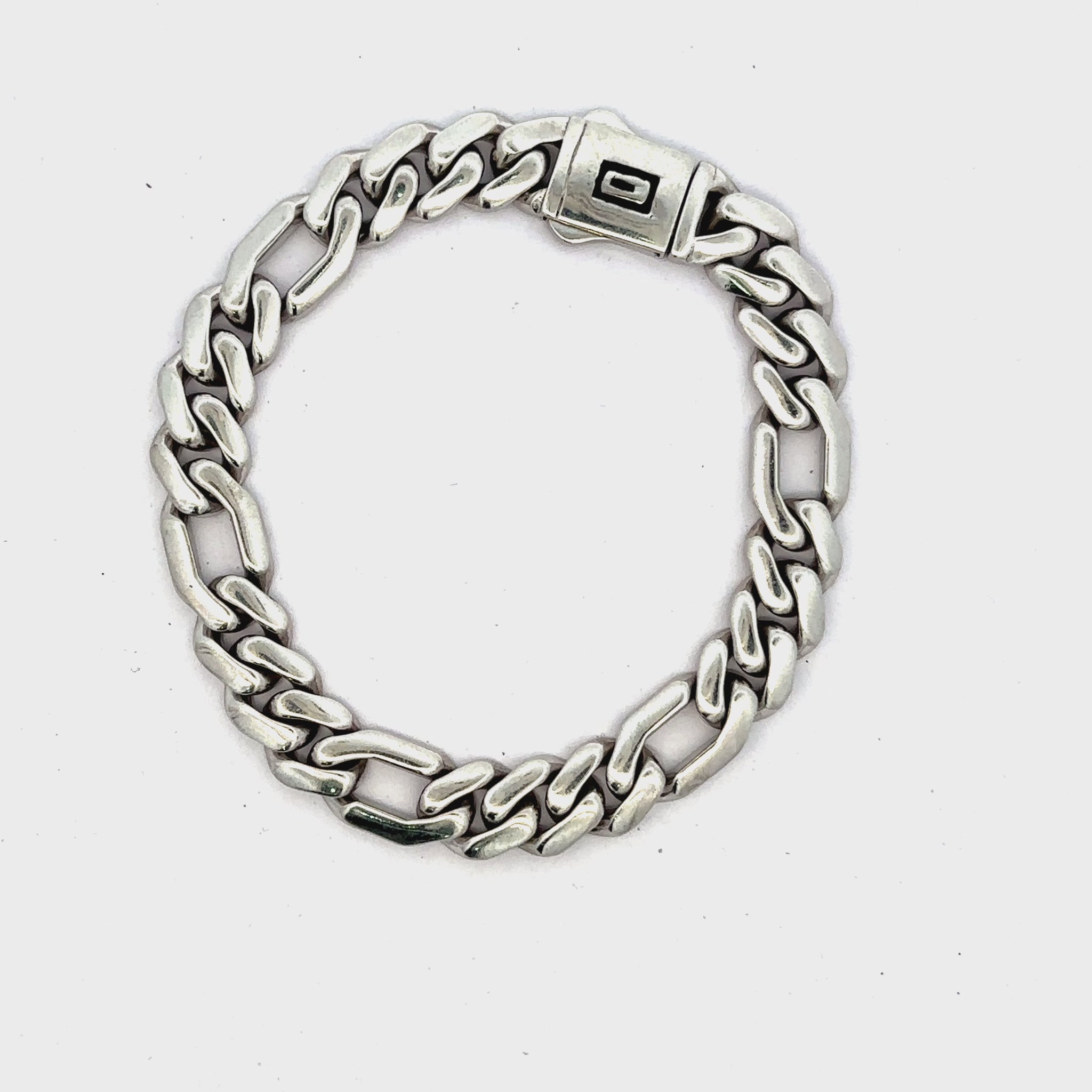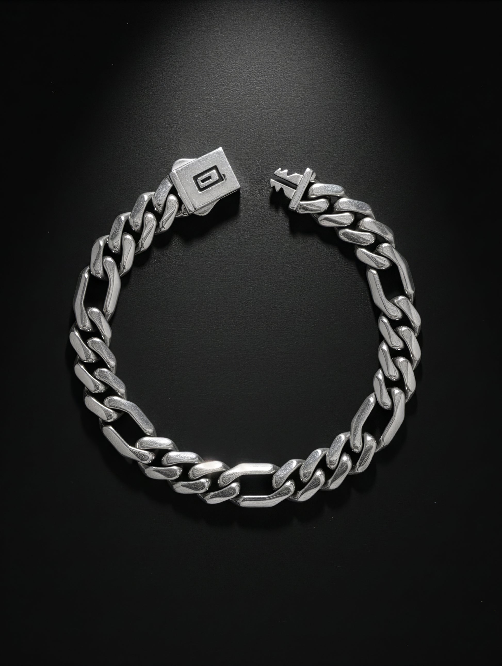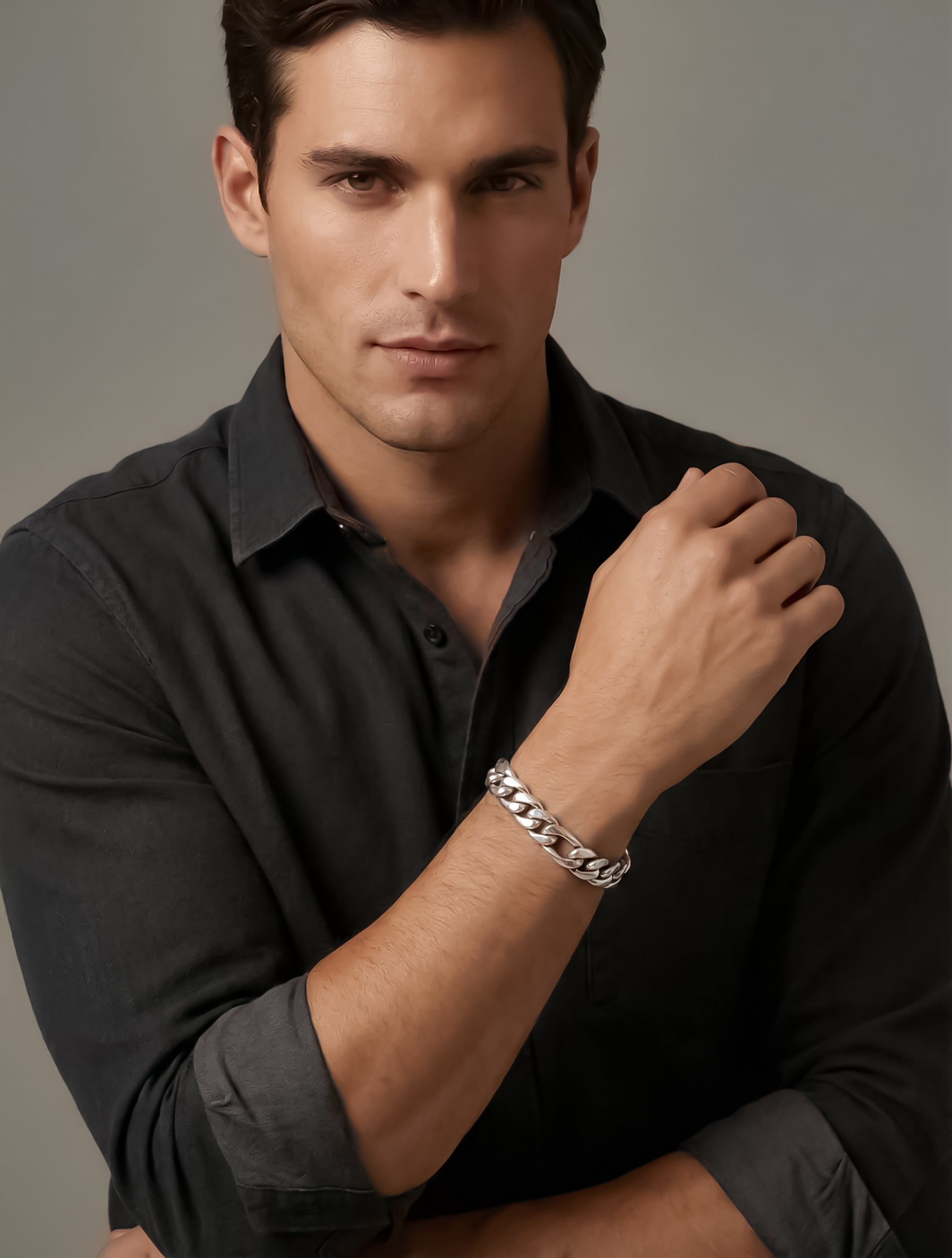 Supremely bold, this bracelet showcases a chunky, high-shine Cuban link chain anchored by a distinctive geometric box clasp. Its clean, weighty silver profile gives a luxurious, statement-making edge to any wrist.