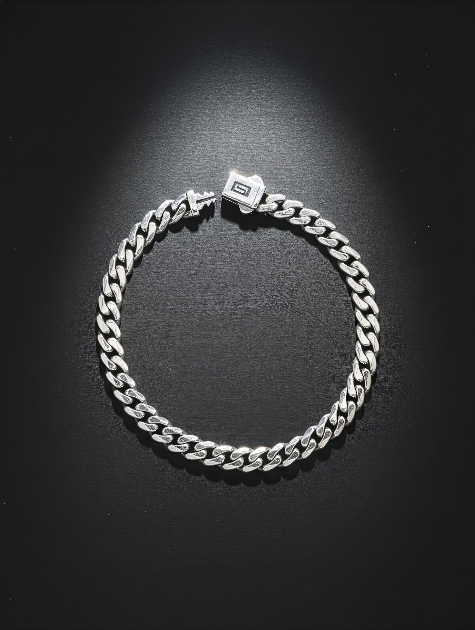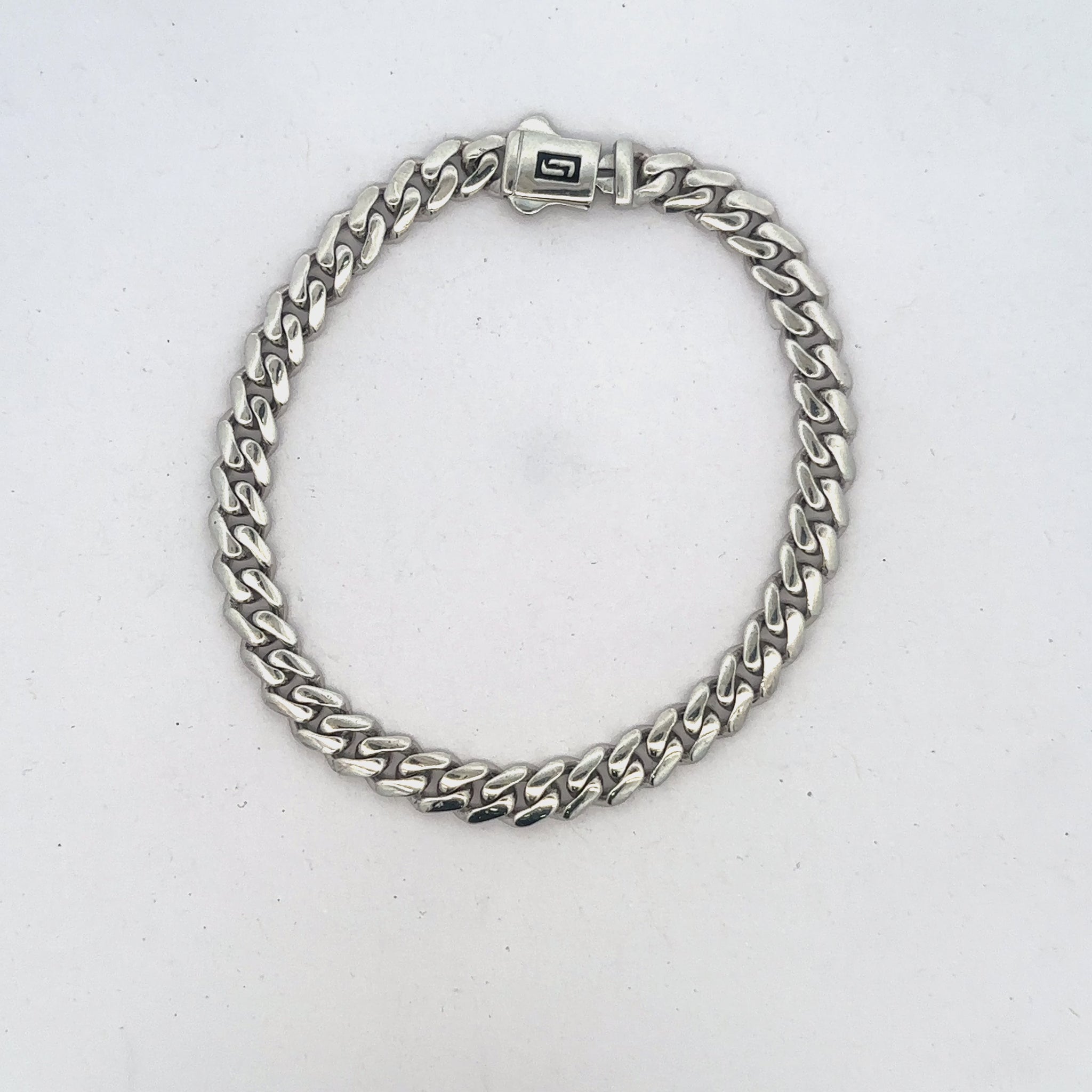 Lavishly sleek, this bracelet features a slim Cuban link chain finished in high-gloss silver for a clean, modern shine. The minimalist box clasp with its subtle emblem detail adds a touch of quiet luxury that elevates everyday style.
