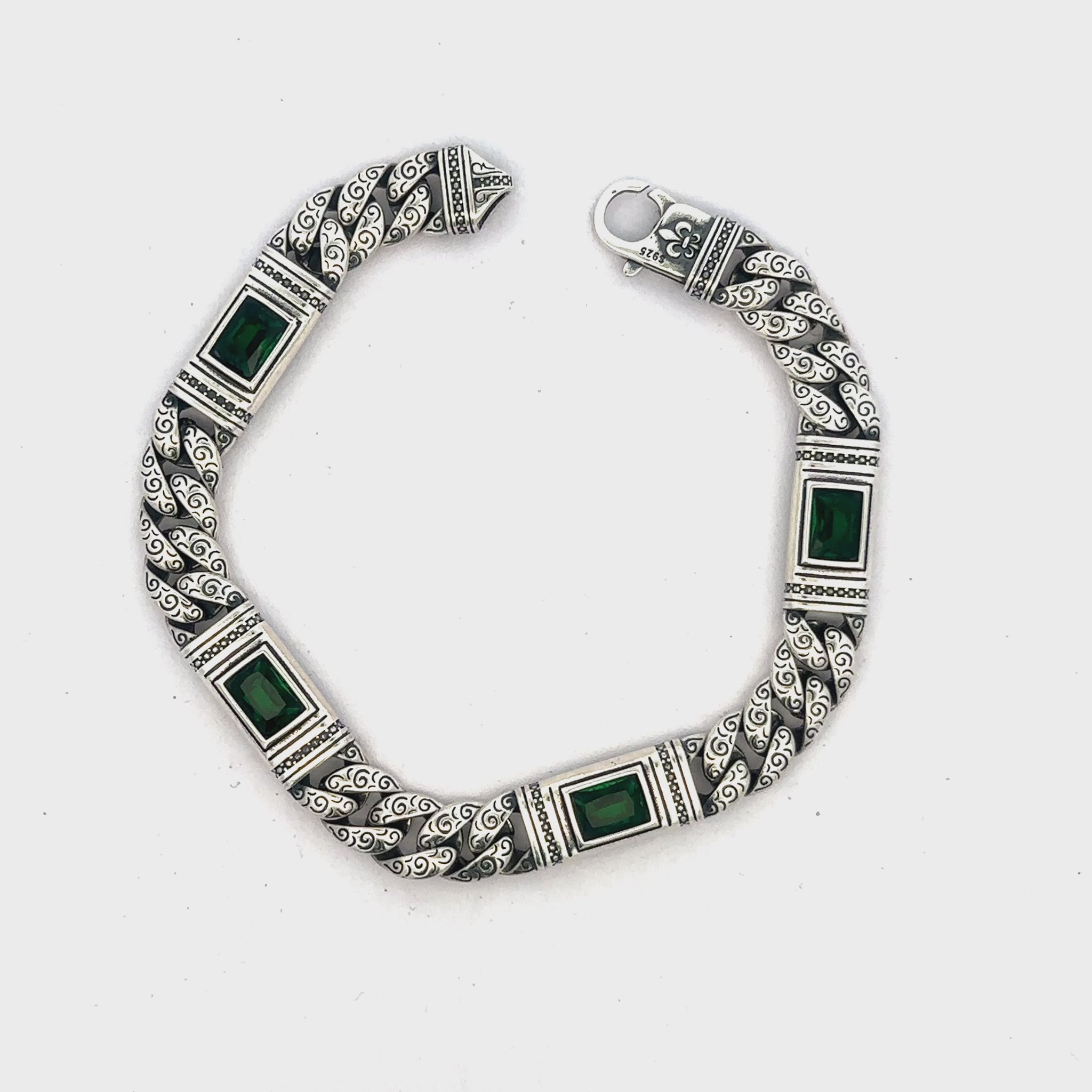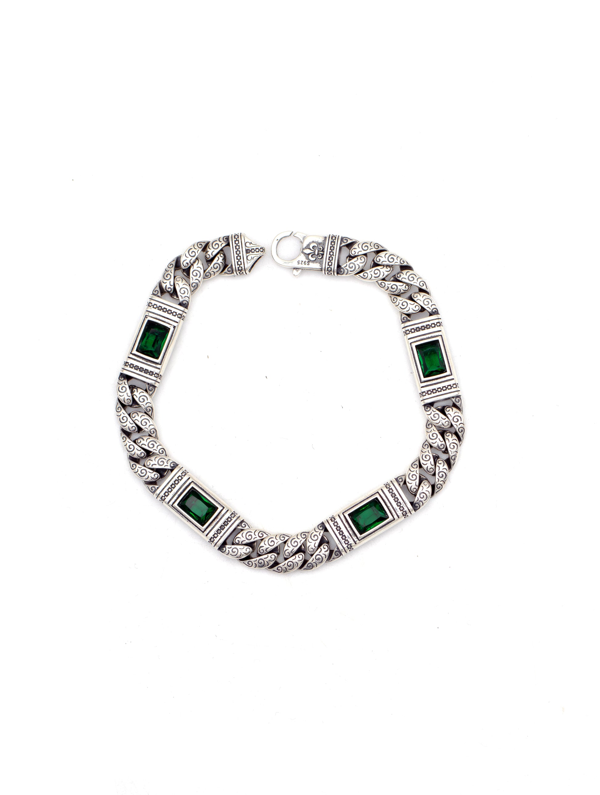 Imperially opulent, this bracelet weaves richly detailed silver scrollwork with vivid emerald-green rectangular stones that glow like tiny royal jewels. The sculpted segments and ornate borders give it an heirloom, palace-inspired charm that makes every wrist feel majestically adorned.