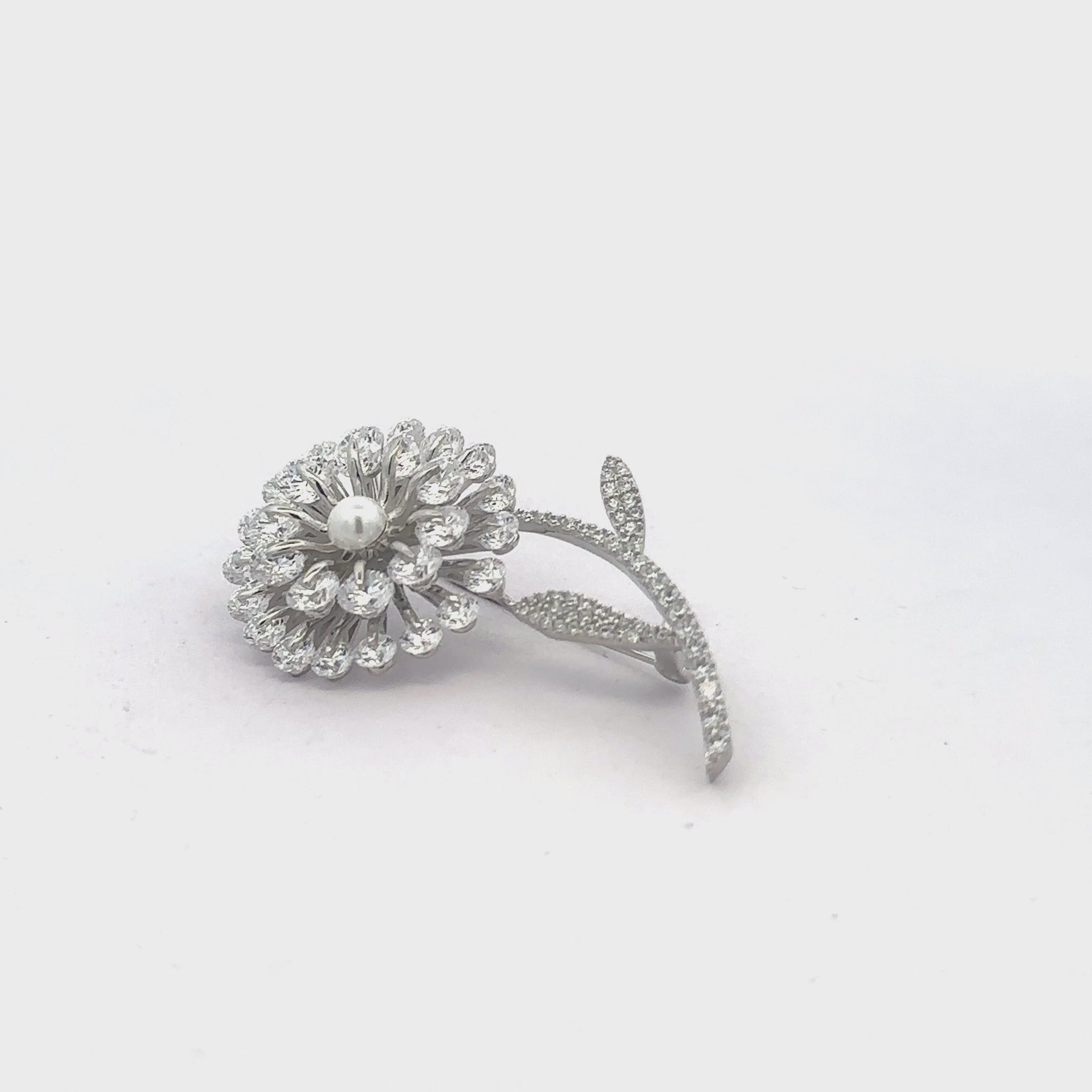 Opulently radiant, this floral brooch blooms with a halo of crystal-clear stones encircling a luminous pearl center. The gracefully curved stem and leaves are paved with sparkling pavé accents, creating a refined statement piece that catches the light with every movement.