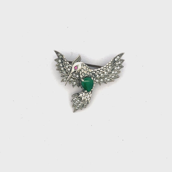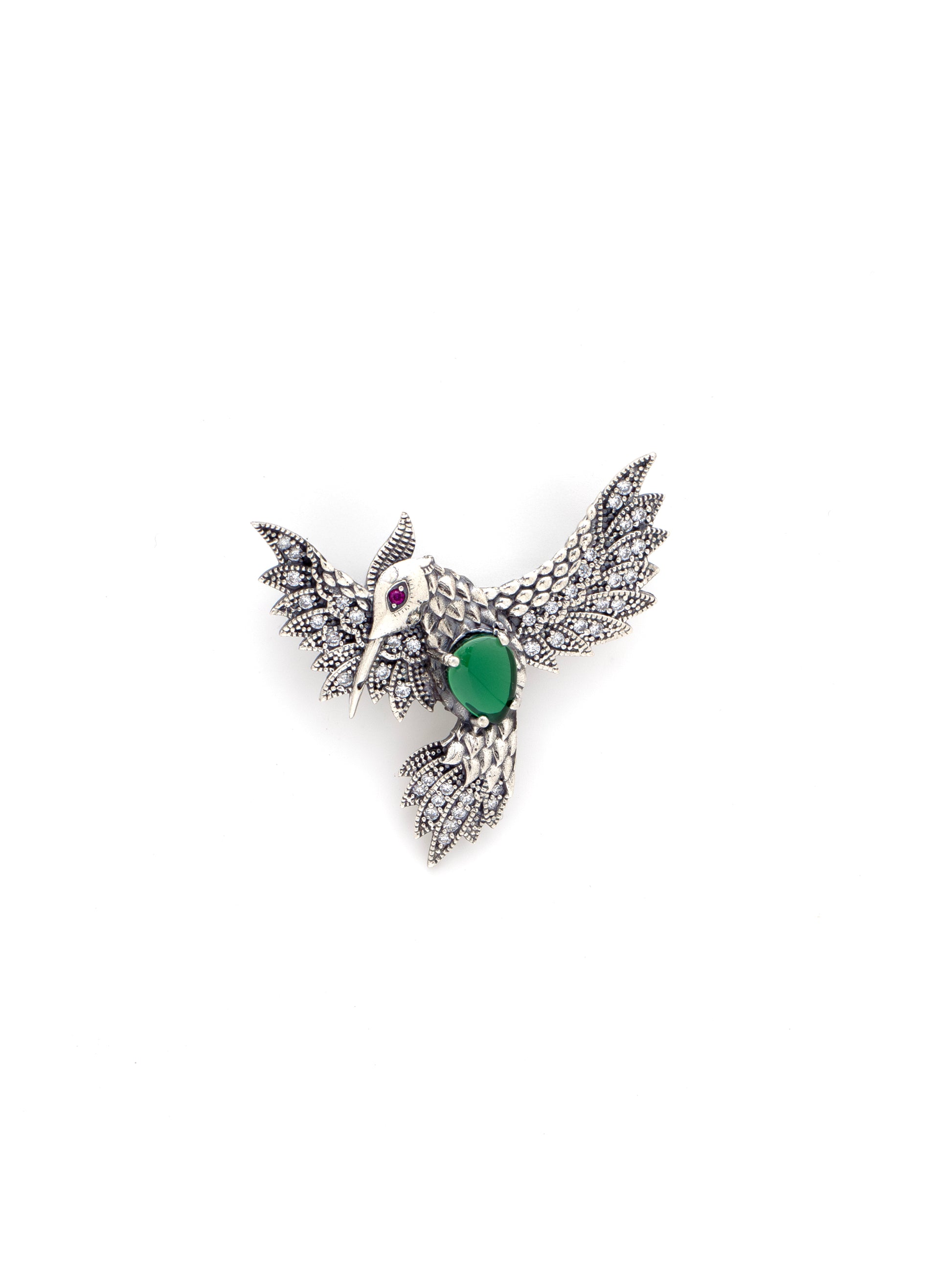 Majestically exquisite, this bird brooch spreads its wings in a blaze of intricate silver scales and glittering stones. A deep emerald-green cabochon forms the heart of the design, while a vivid ruby-toned eye adds a touch of regal mystery, turning any outfit into a statement of artful luxury.