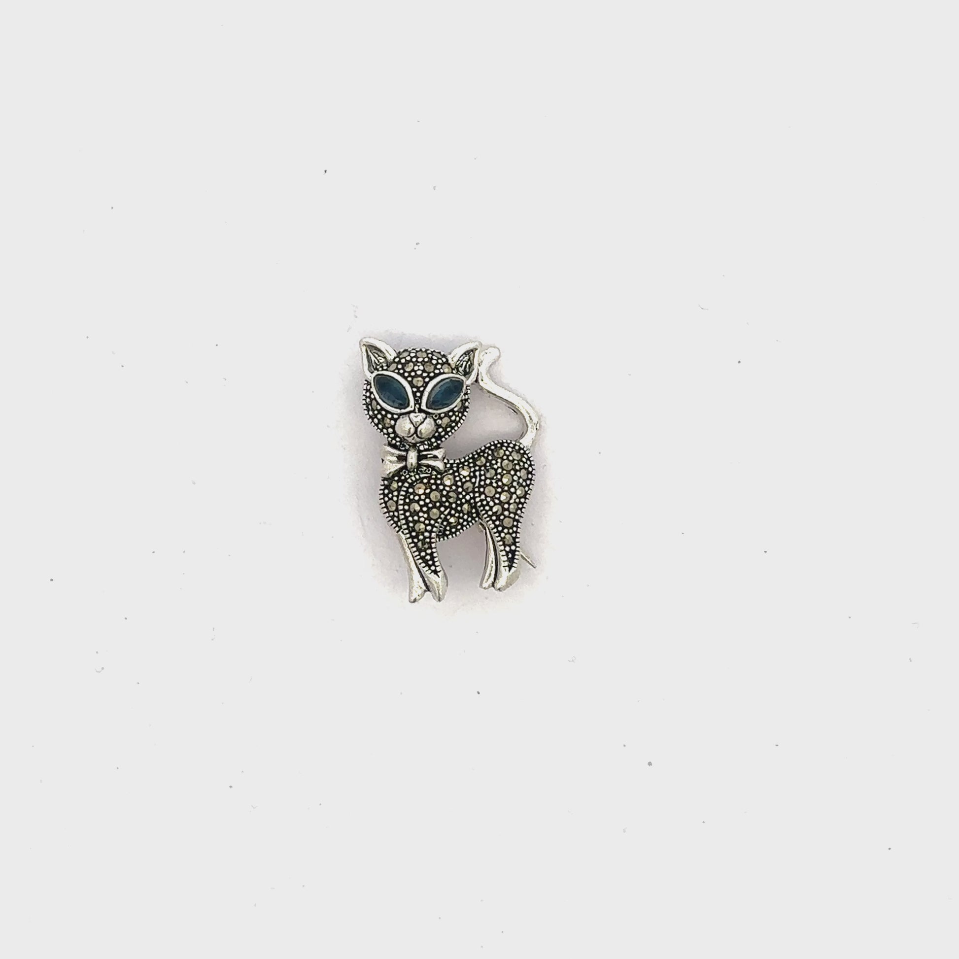 Chicly decadent, this playful cat brooch struts in shimmering marcasite-style sparkle, finished with glossy dark gemstone eyes for a touch of feline mystery. The dainty bow and sleek silver tail add whimsical elegance, making it a luxurious little companion for lapels, scarves, or bags.