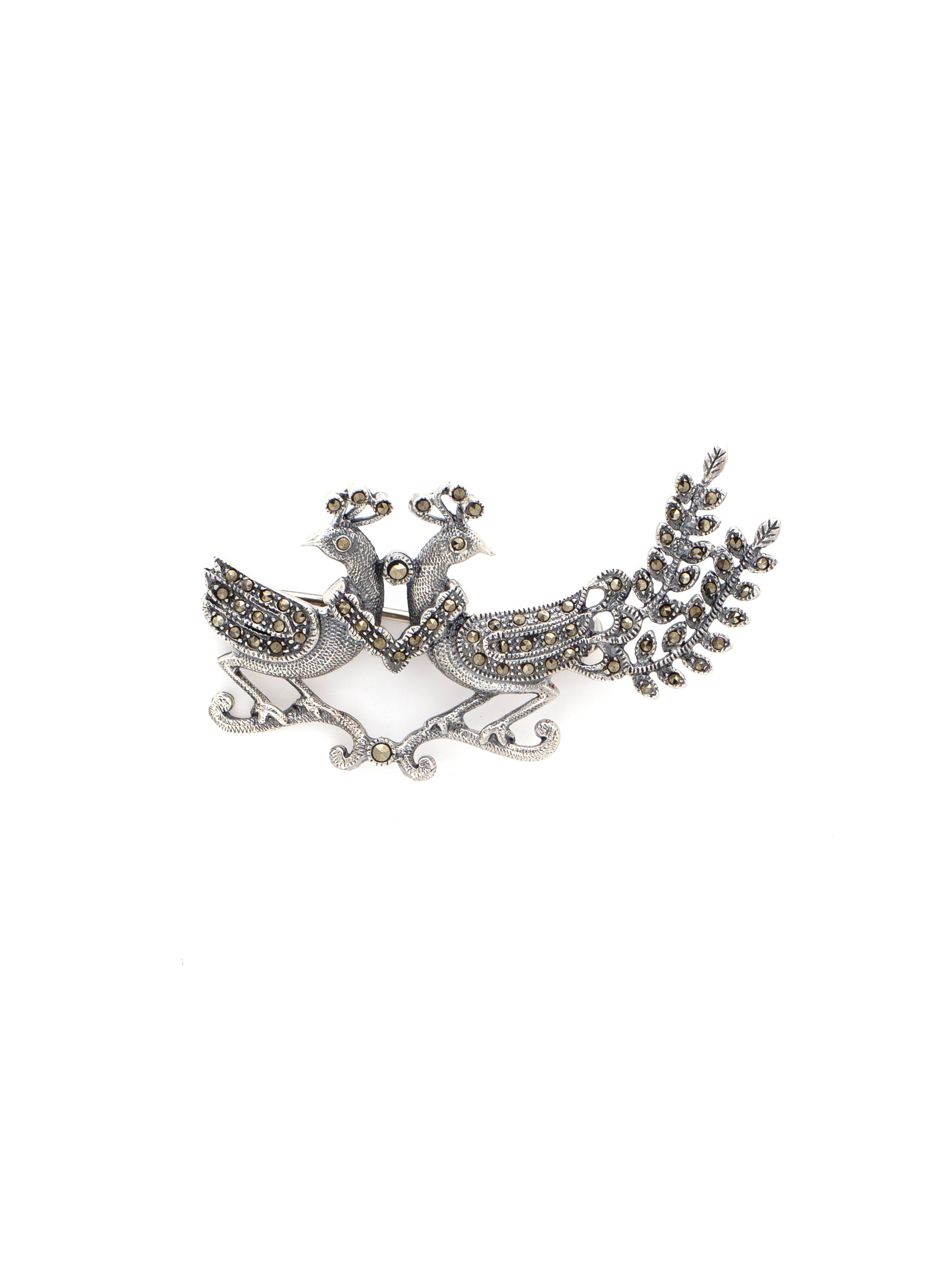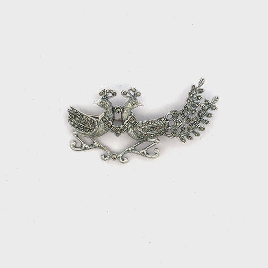 Regally romantic, this twin-peacock brooch entwines two graceful birds in shimmering silver, their bodies and crowns studded with vintage-style marcasite sparkle. The sweeping, feathered tails create an ornate silhouette, making it a luxurious emblem of elegance and eternal partnership.